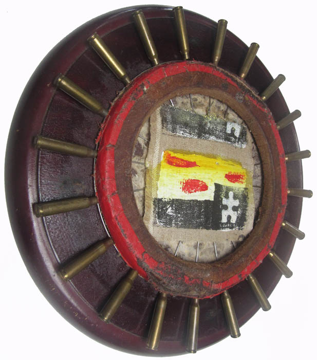 Small painting on canvas, mounted on wood with found 'frame' and bullets