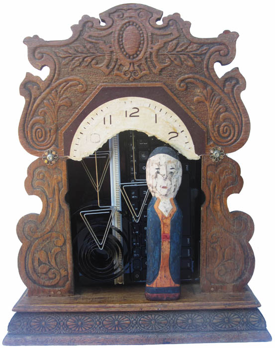iPad keyboard, old clock surround, carved wooden figure from antique stall in Seoul, Korea