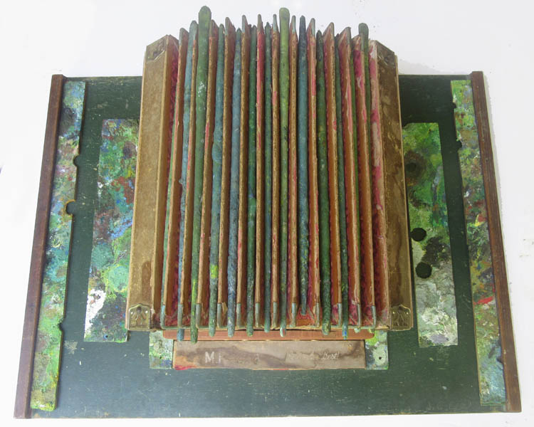 Supported in the body of an old button accordion, mounted, with strips of the palette board, onto an old blackboard.
