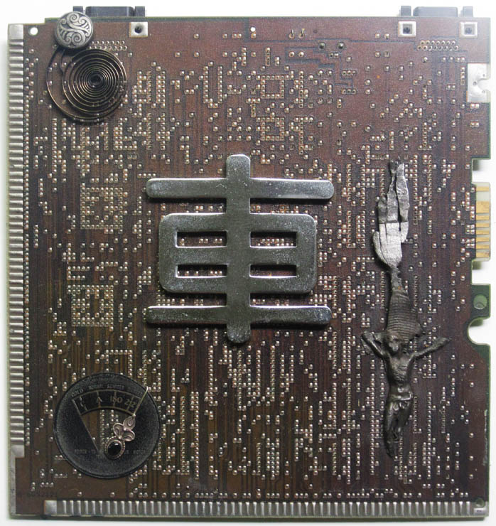 stainless steel 'CAR' symbol, temperature guage and figure I cast in lead, all on a circuit board.