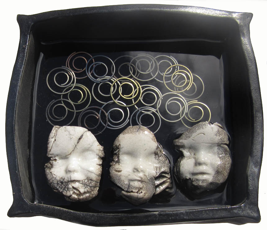 Ceramic faces which has split in the kiln.