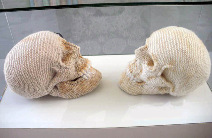 Two life sized hand knitted woollen skulls face each other.