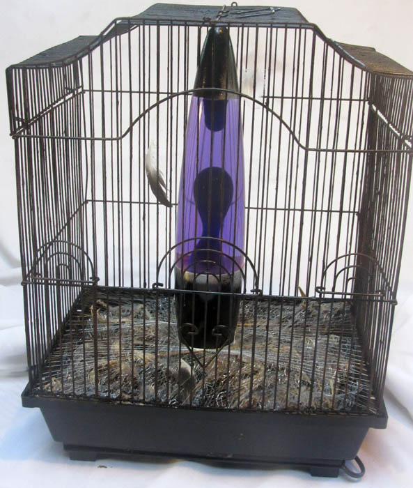 Old lava lamp, feathers, silver thread, and a couple of dozen bird skeletons