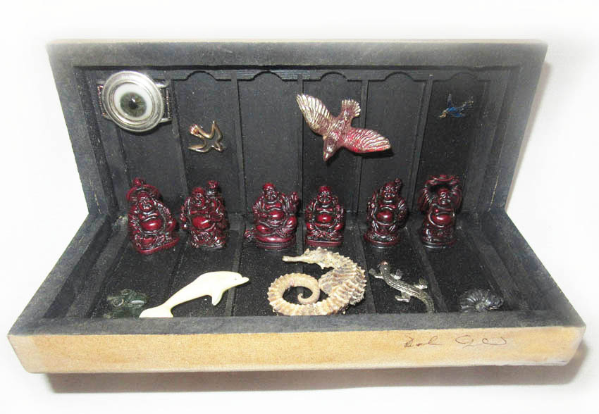Earth figures below: Pounamu heitiki, fossil ammonite, mummified sea horse, carved bone dolphin