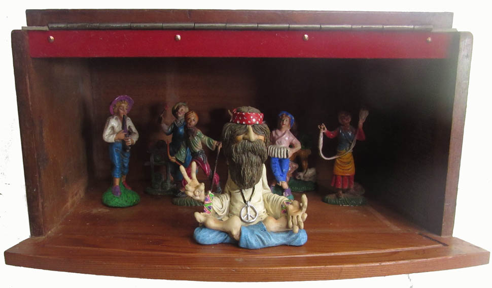 figures in old microscope box, with lights.