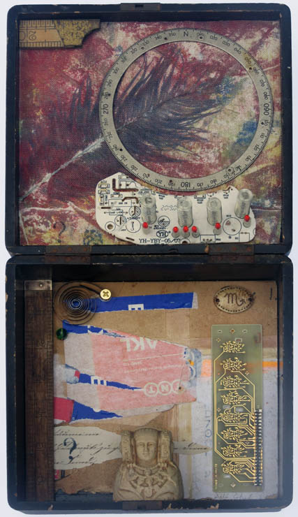with circuit boards, scraps of paper & linen